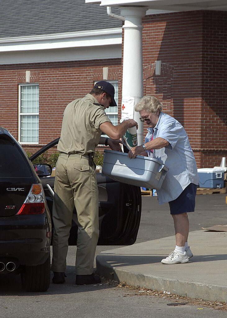A Dutch sailor helps a victim of Hurricane Katrina load supplies in her car at First Church, Biloxi, on Sept. 12, 2005. The Dutch Navy is assisted the U.S. Navy in providing humanitarian assistance to victims of the hurricane. (Photo credit: Pedro A. Rodriguez) ..