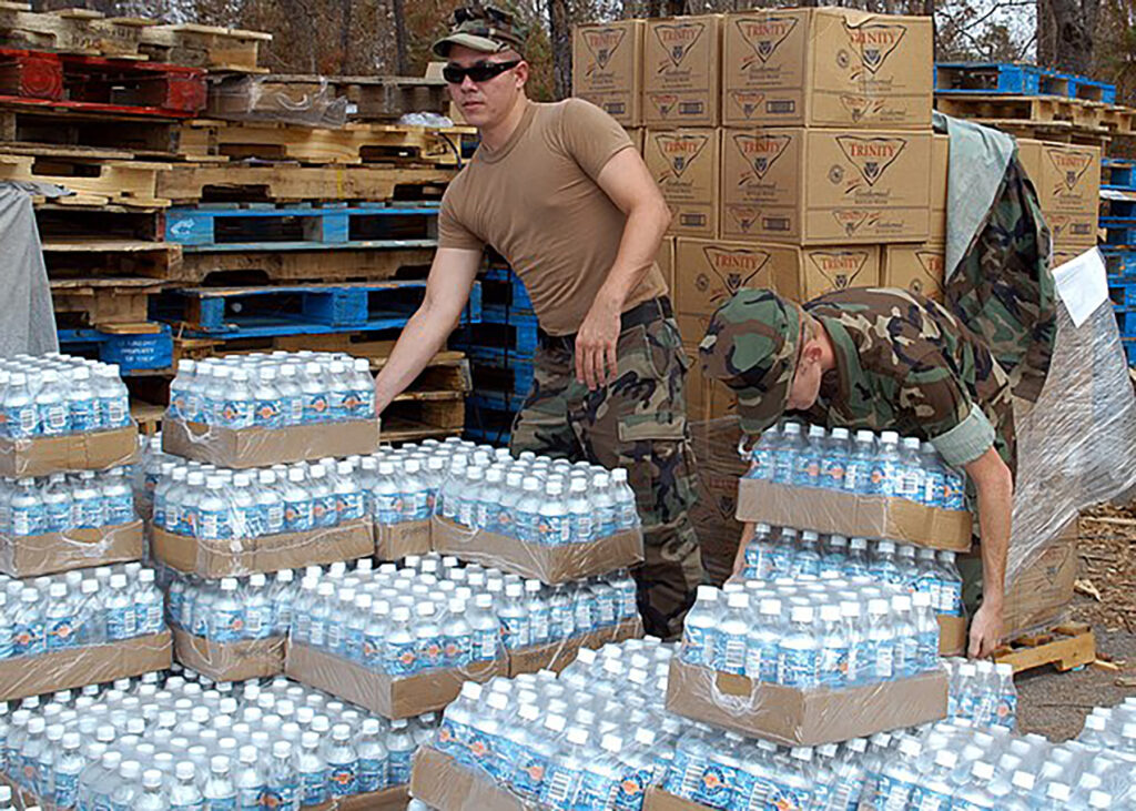 Seabees from Navy Mobile Construction Battalion One, based out of Gulfport, Miss., organize bottled water to give to families at First Church, Biloxi, on Sept. 12, 2005. The church served as a distribution hub for food, water and supplies to victims of Hurricane Katrina in the Biloxi area. (Photo credit: Joanne De Vera)
