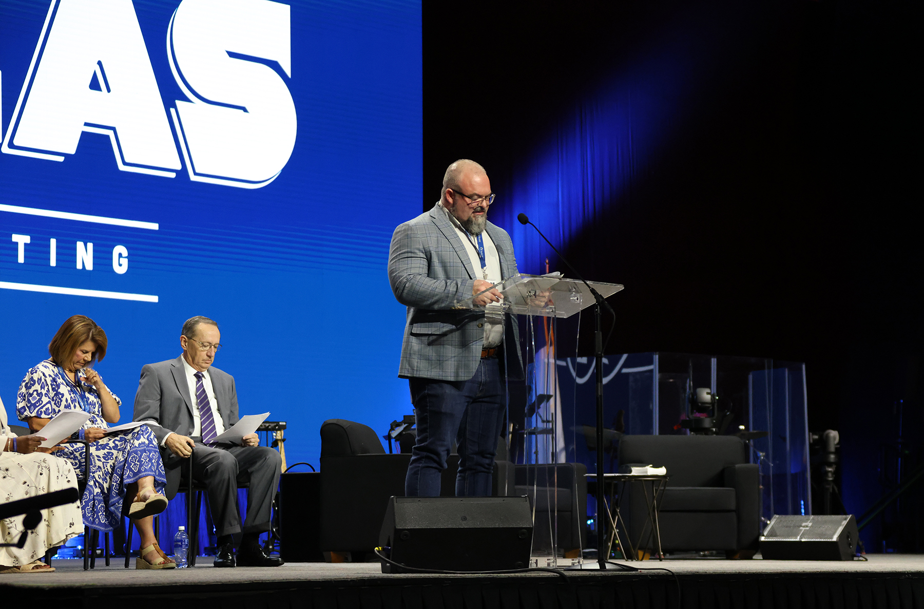 Rhett Burns, pastor of First Church in Traveler’s Rest, S.C., introduced a motion to amend the proposed plan.
