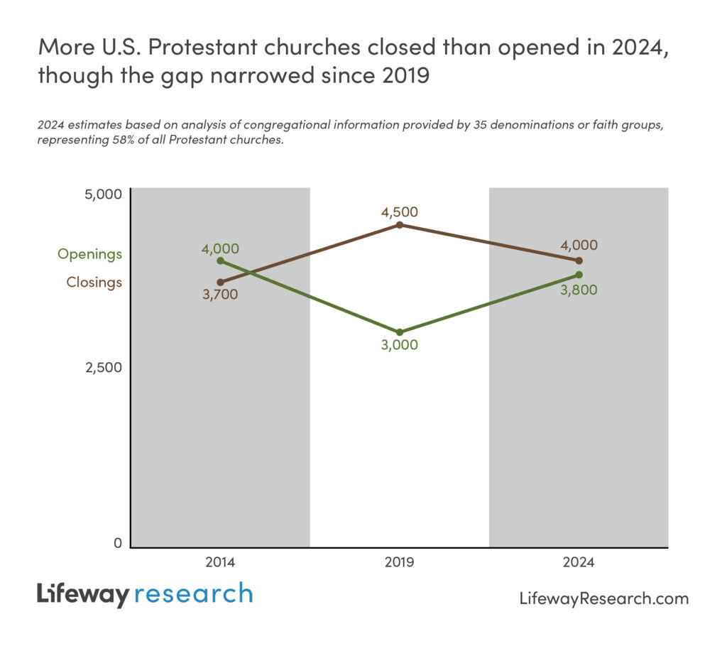In 2024, Lifeway Research estimates 3,800 new Protestant churches were started in the U.S., while 4,000 churches were closed. This is based on analysis of congregational information provided by 35 denominations or faith groups, representing 58 percent of all Protestant churches.