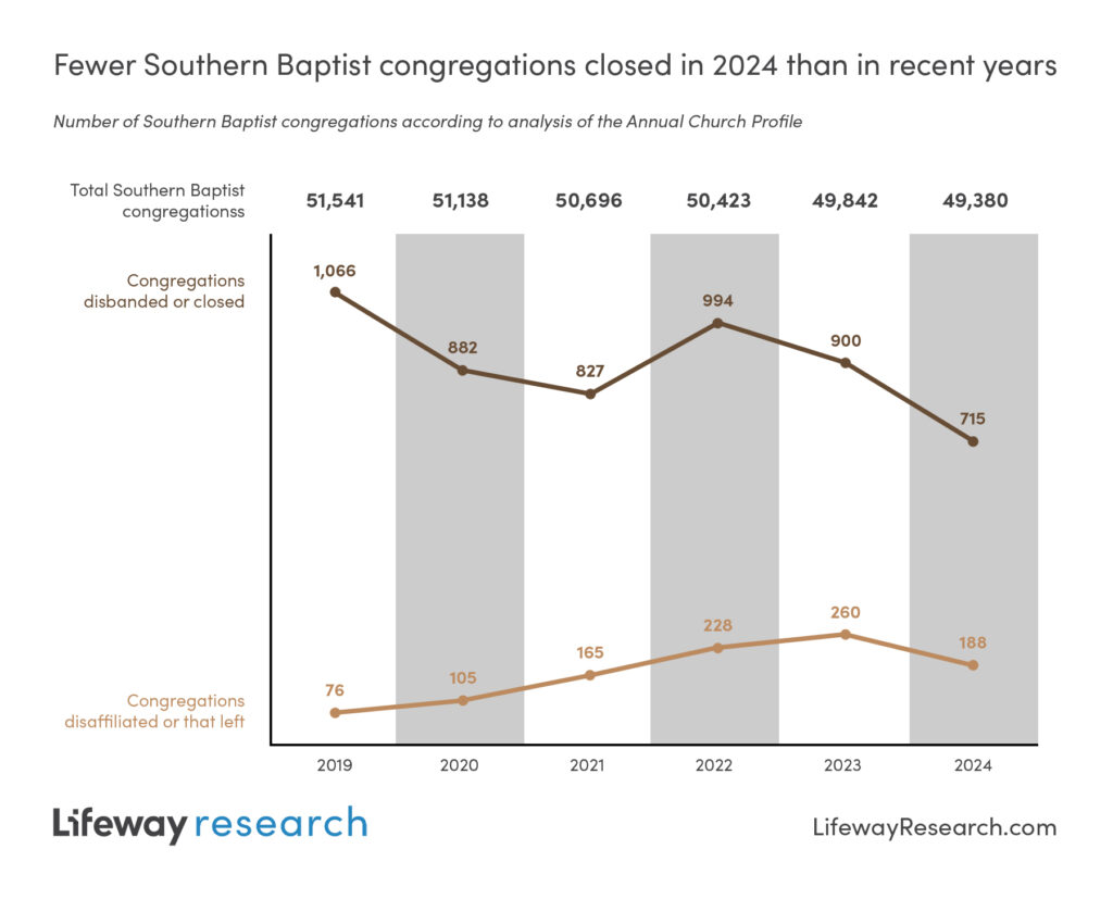 The number of Southern Baptist congregations peaked in 2017 and has declined each year since. However, the 715 that disbanded or closed in 2024 represent the smallest annual loss during the decline.
