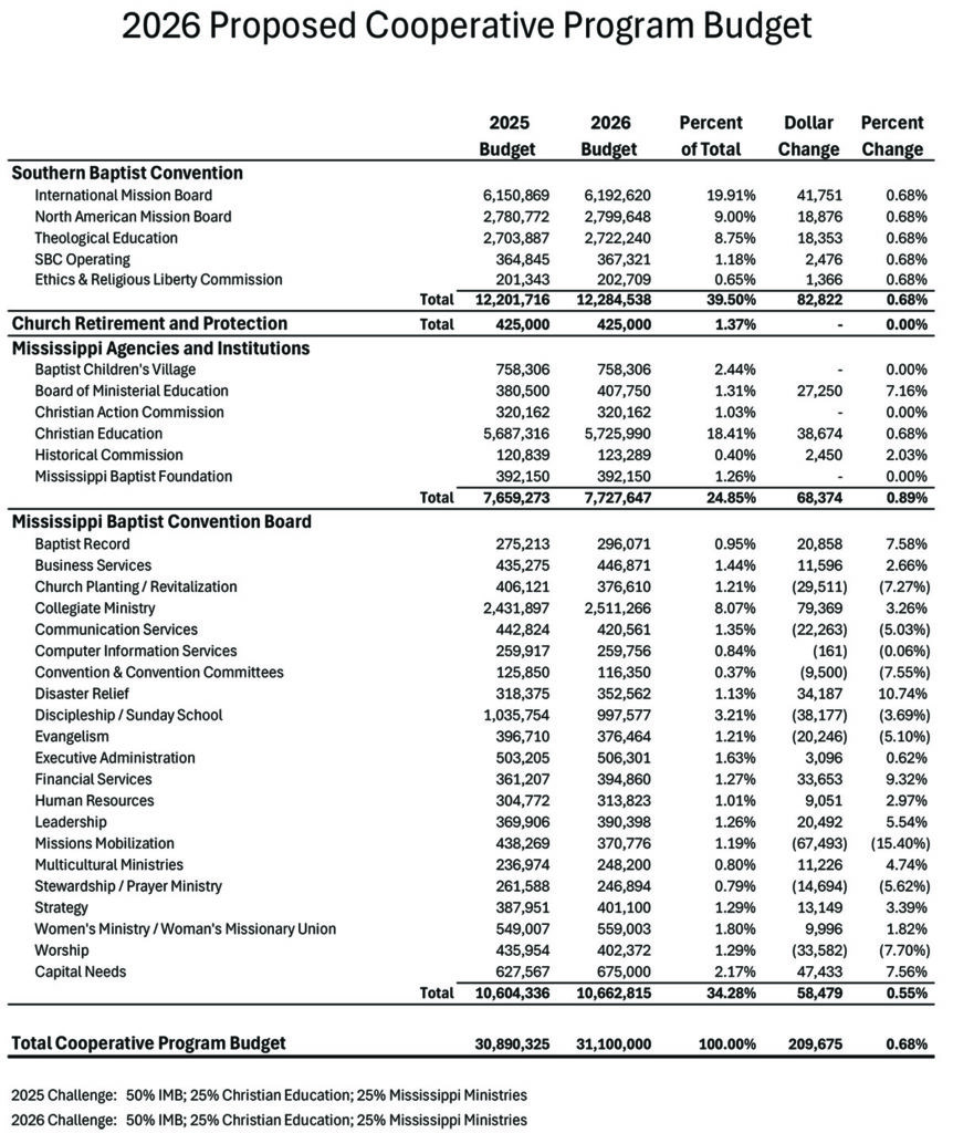 Michael Barnett presented the Budget Committee’s recommendation for the 2026 Proposed Cooperative Program (CP) budget to the EC and to the full 100-member Board. The proposal, which can be viewed in full below, increases the budget total to $31,100,000, a 0.68% change from the current year. The 2026 Proposed CP Budget was approved unanimously.