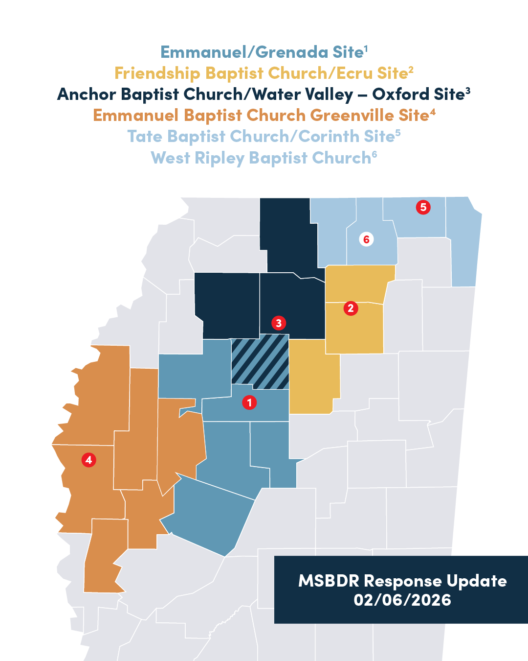 MSBDR will continue accepting work requests at all active sites and anticipates that operations will continue through most of February. Available MSBDR volunteers should notify the MSBDR Office of their availability. MSBDR volunteers ask Mississippi Baptists to continue to pray for affected families, for safety in ongoing recovery operations, and for continued opportunities to share the hope of Christ through compassionate service.