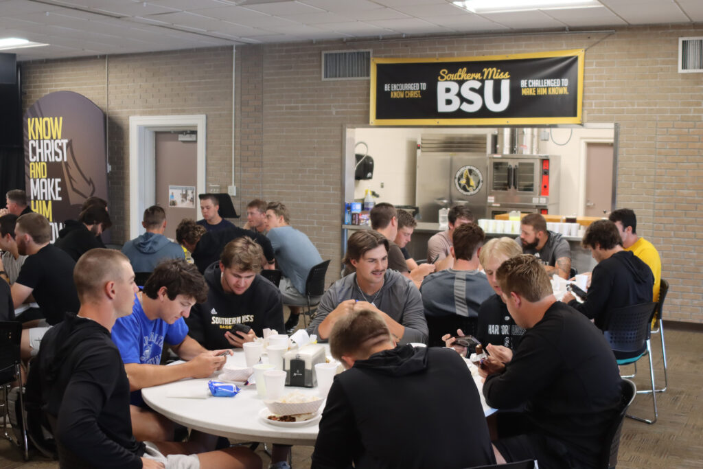 Disciples in the dugout: Team chaplain, BSU reach athletes throughout the weekBaseball players enjoy a meal and devotional during a weekly luncheon at the USM BSU. (Photo credit: Tanner Cade) Disciples in the dugout: Team chaplain, BSU reach athletes throughout the week March 21, 2025