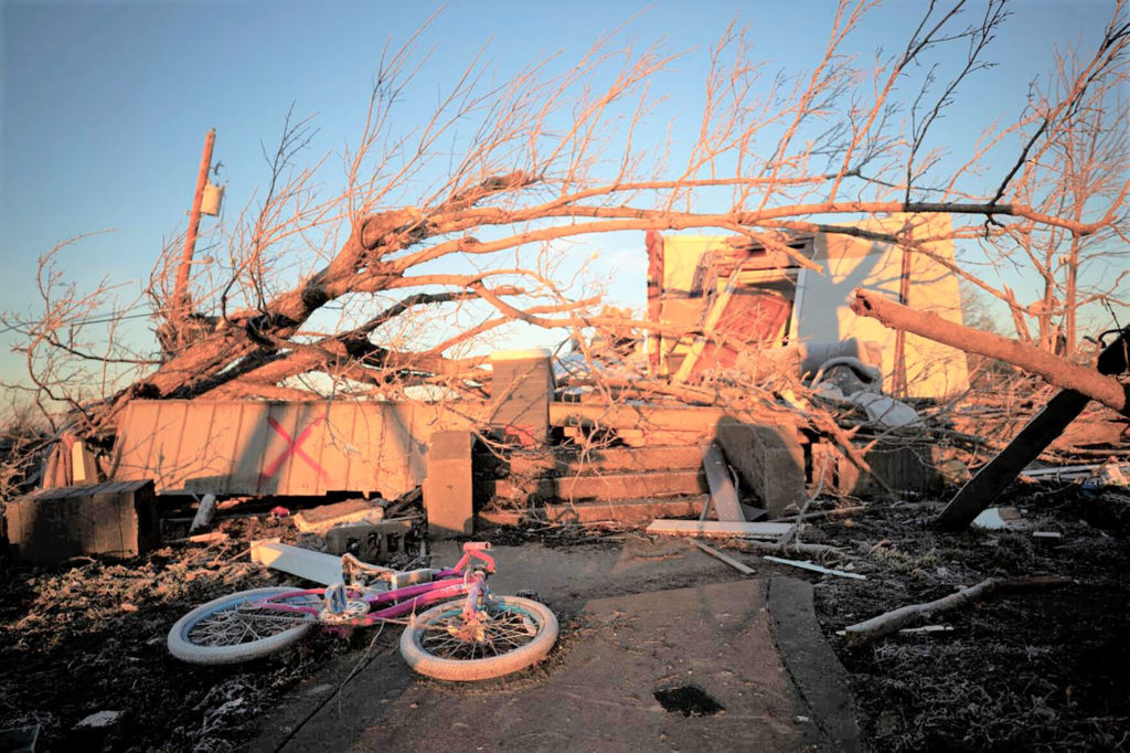 REDUCED TO RUBBLE — A child’s bicycle is all that remains to mark the site of a home in Dawson Springs, Ky., destroyed after a massive tornado that passed through the area on Dec. 11. (Photo credit: Kentucky Today)