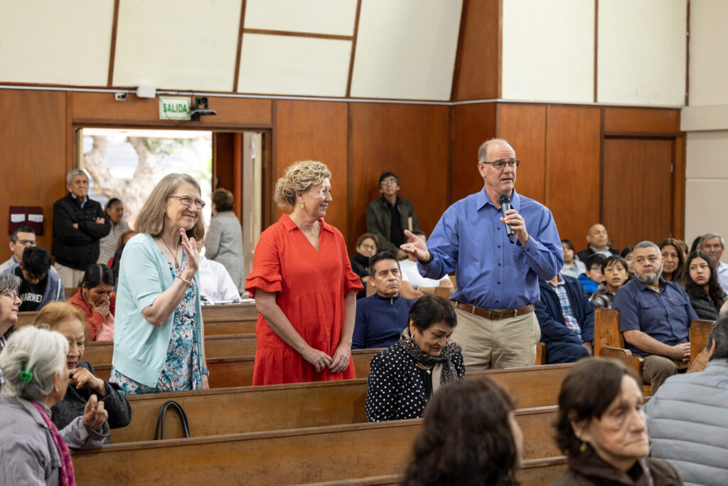 Ann Iorg and Michelle Chitwood are introduced by IMB missionary Mike Brungardt at Iglesia Bautista Ebenezer in Lima, Peru. Founded in 1951, Ebenezer is the oldest Southern Baptist church in the country and a cornerstone of the Peruvian Baptist movement. Pastor Ramón Correa Revilla has faithfully served the church for nearly 40 years. (Photo credit: IMB)